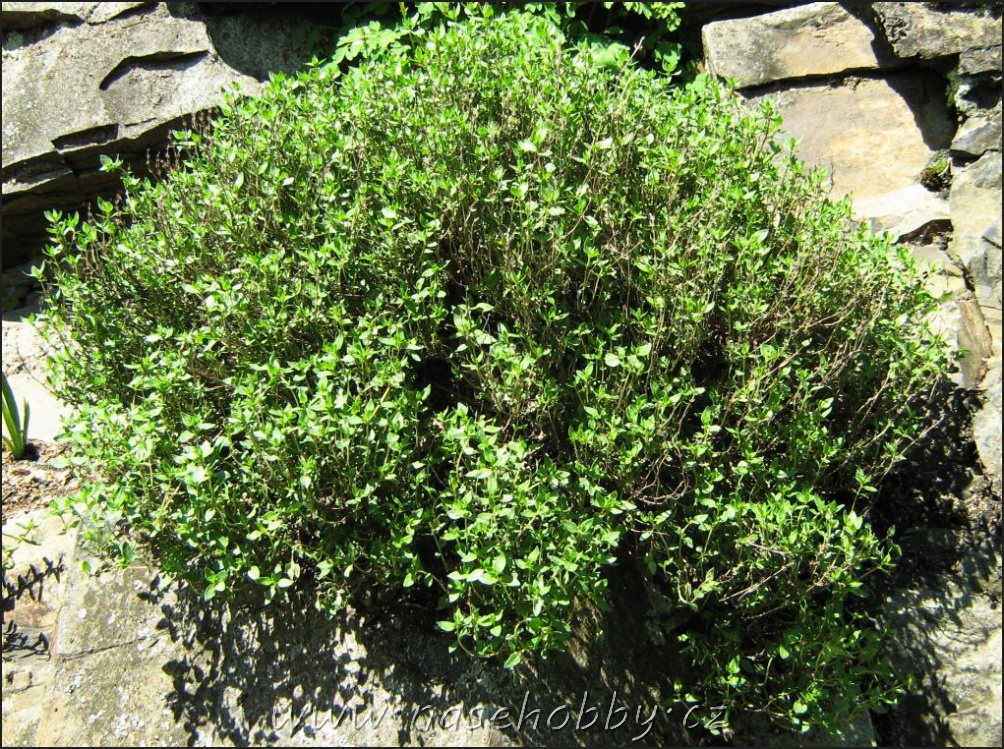 Podle odrůdy je tenhle až na pronikavou vůni celkem nenápadný keřík – Tymián obecný (Thymus vulgaris) až čtyřicet centimetrů vysoký. Stonky má čtyřhranné postupně dřevnatí a voňavé čárkovité šedozelené lístky jsou na rubu plstnaté. Od května se může rozzářit nachovými, ale i bílými kvítky. Pokud má opravdu správně vonět, potřebuje růst na plném slunci. Pochází sice ze Středomoří, ale dnes roste ve všech teplých oblastech světa.